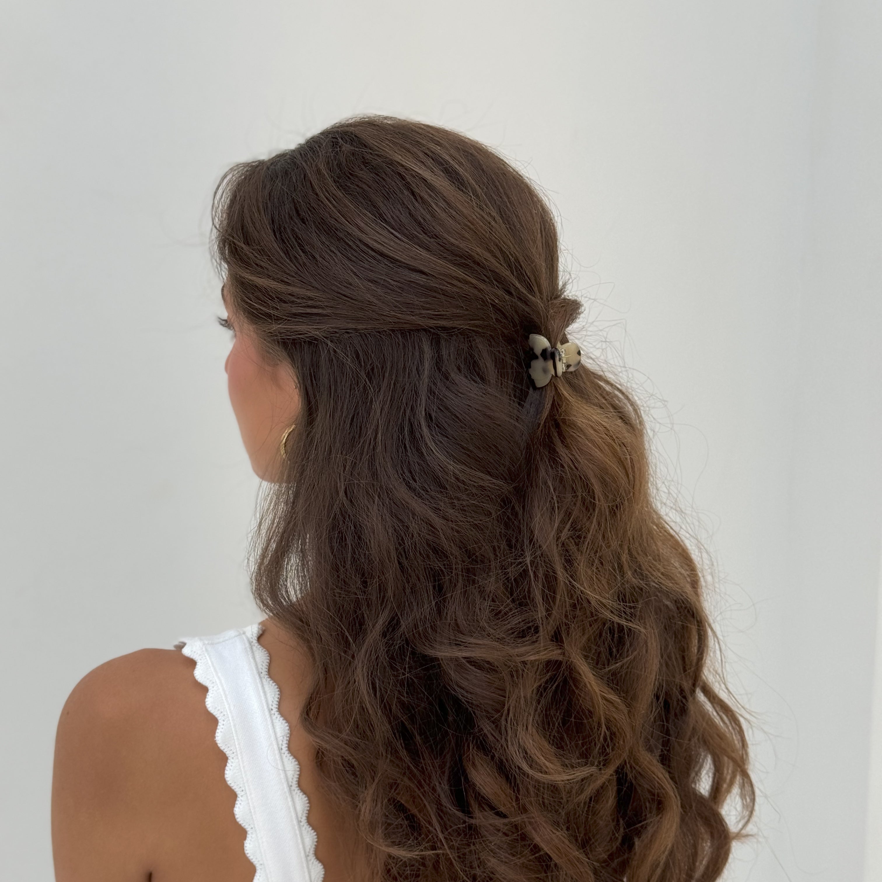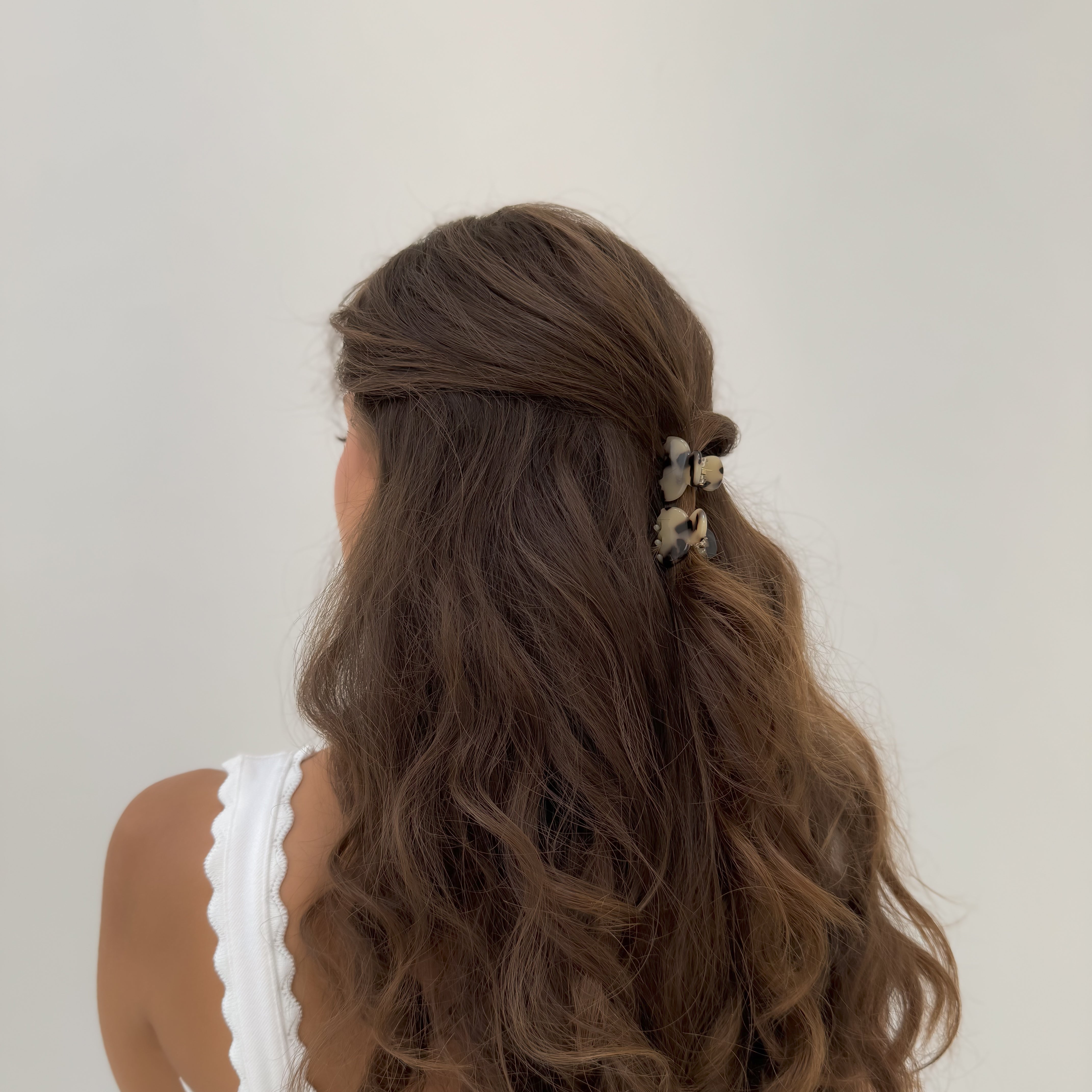 Short Hair - Mini Square claw clips are recommended for half-up hairstyles. Midi claws are recommended for a full-up hairdo.