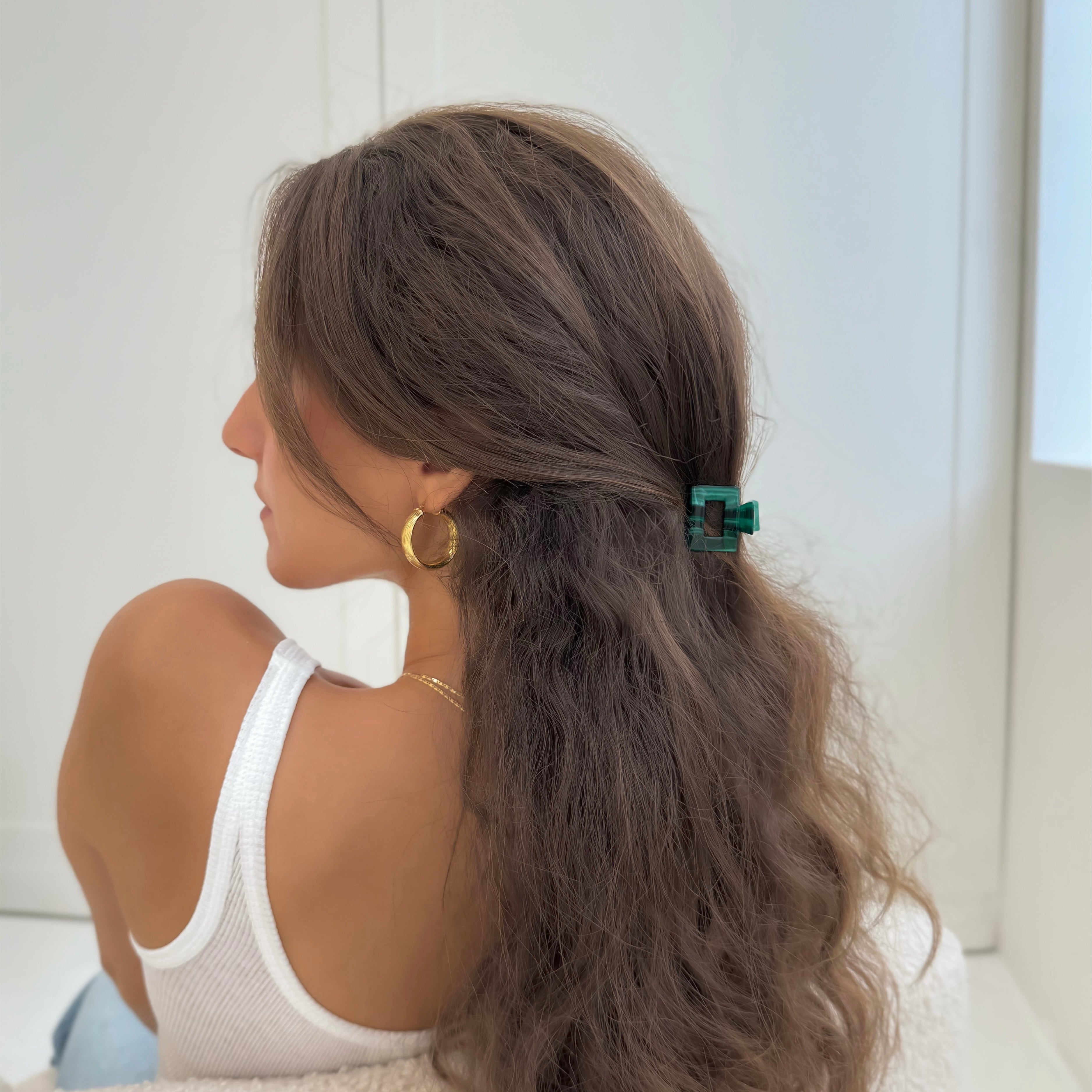 Short Hair - Mini Square claw clips are recommended for half-up hairstyles. Midi claws are recommended for a full-up hairdo.