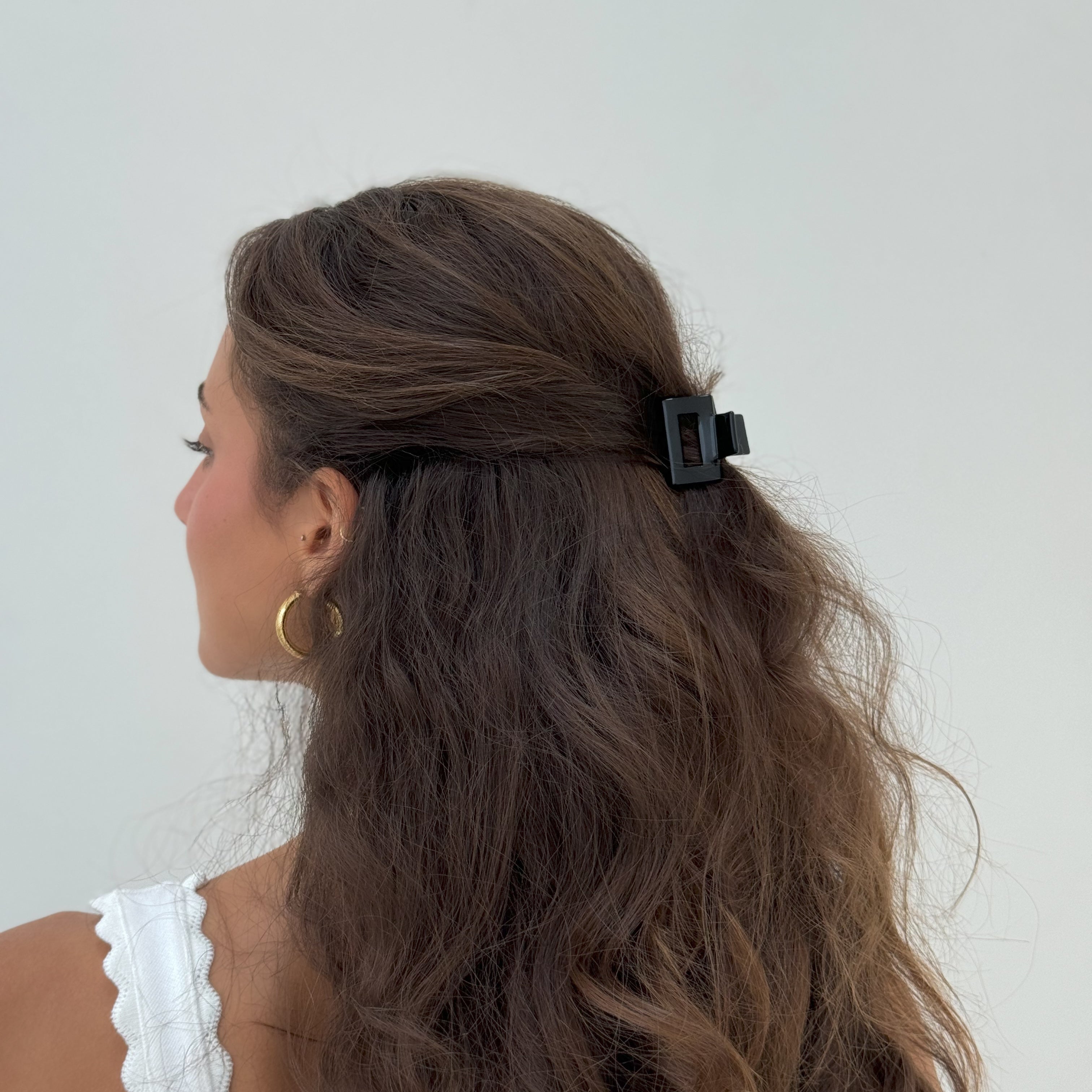 Short Hair - Mini Square claw clips are recommended for half-up hairstyles. Midi claws are recommended for a full-up hairdo.