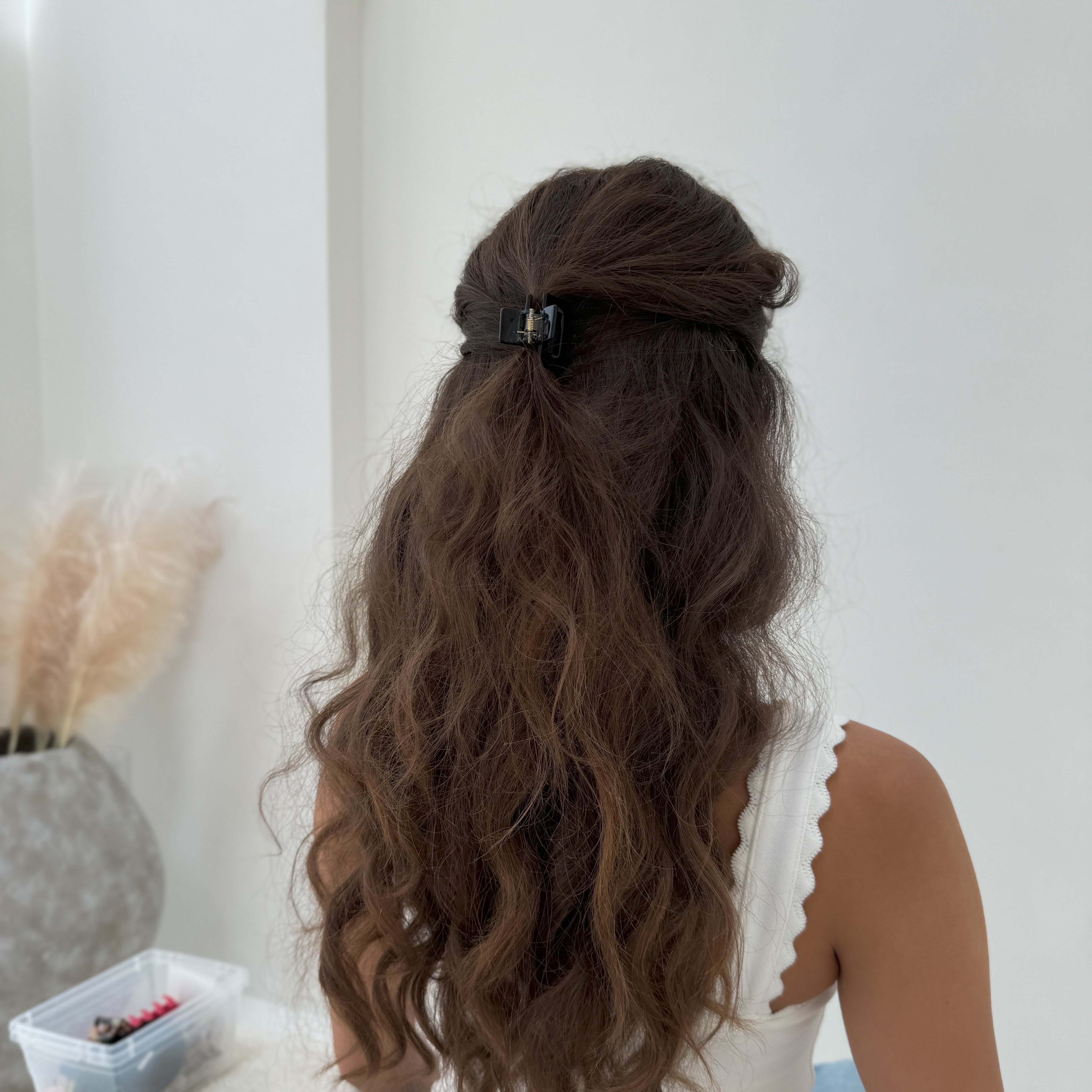 Curly/Thick Hair - XL claw clips are recommended for a full-up hairstyle and both Large & Midi claw clips are recommended for half-up hairstyles.