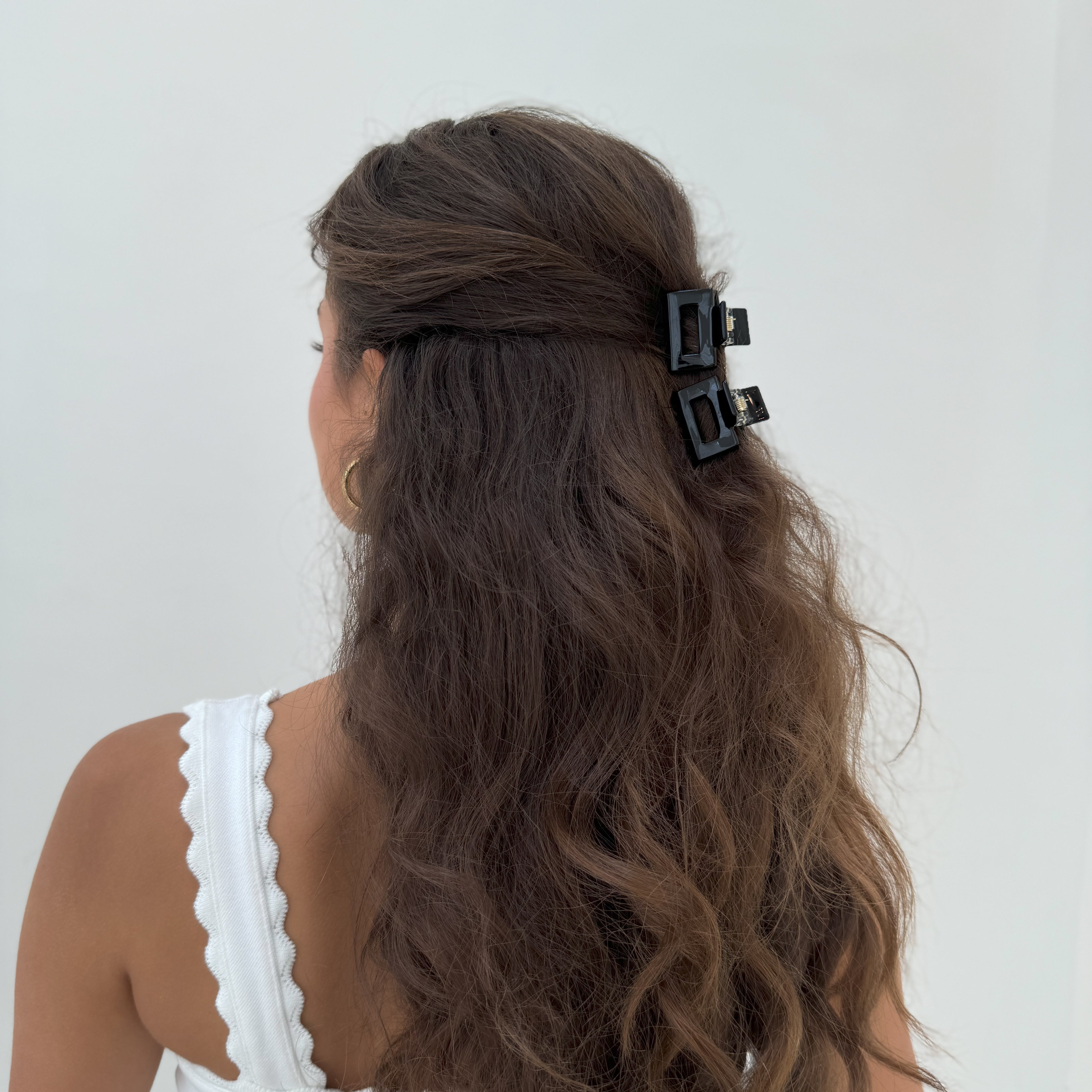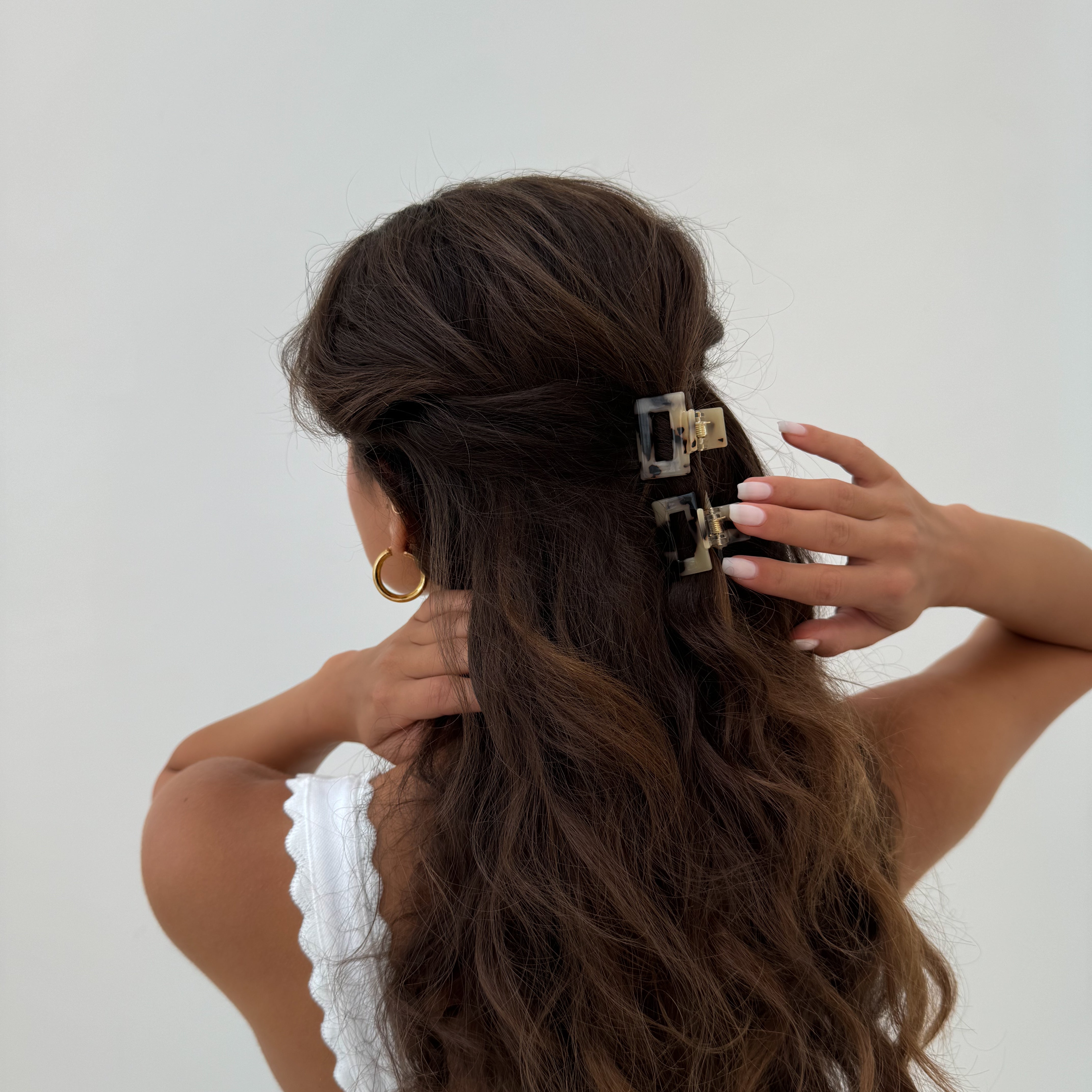 Designed in Toronto, the Mini Square Claw Clip Set is crafted from luxurious cotton & wood pulp acetate and securely holds all hair types, from the thickest curls to the finest, slipperiest strands. This pack of two clips offers versatile styling options, perfect for securing smaller sections or creating unique looks. Engineered for all-day hold, these small-yet-mighty claws combine durability with a refined style, ensuring a secure, all-day grip.