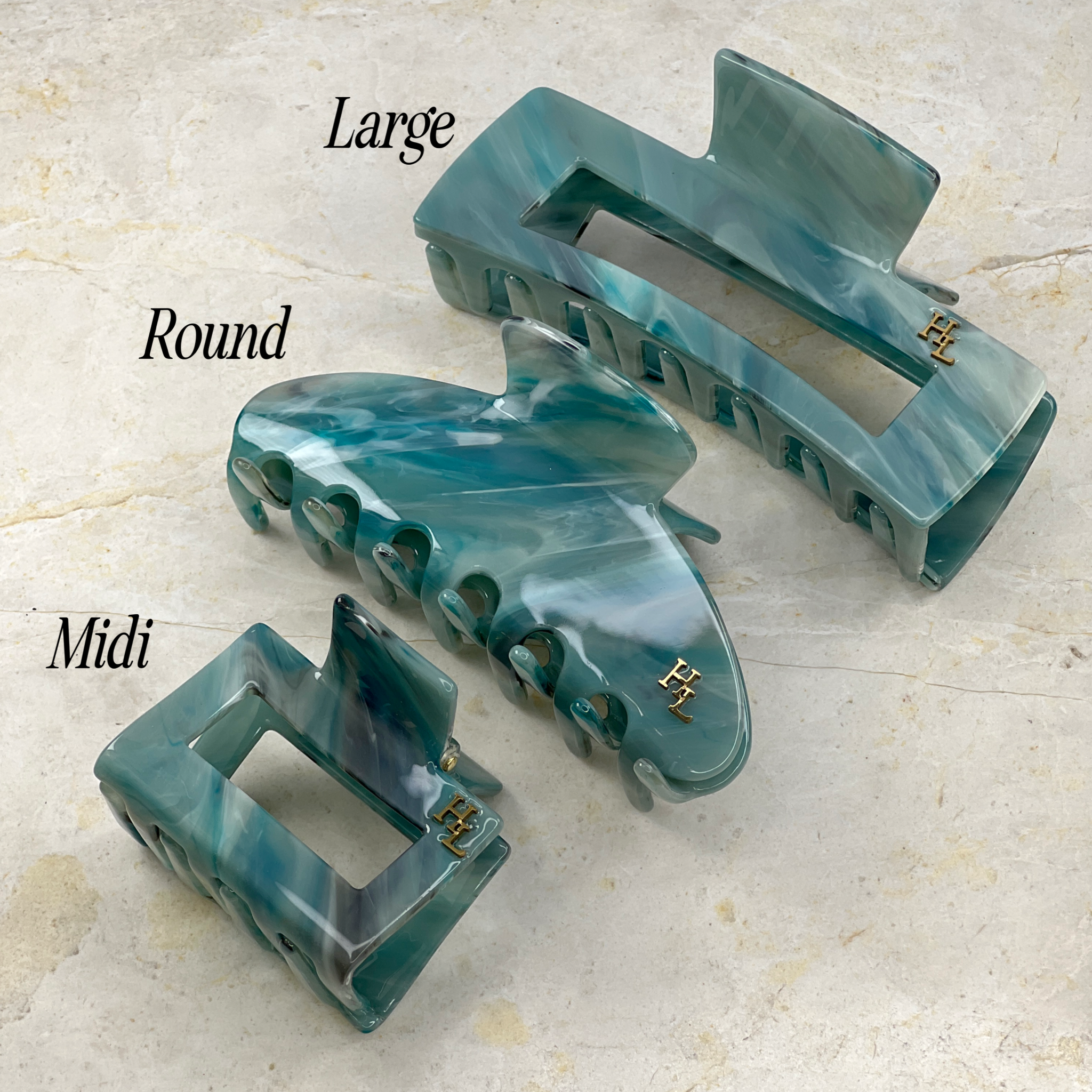 Our main sizes are Mini and Mini Square, Midi, Large, Round and XL. Each clip serves different hair types and hairstyle purposes.