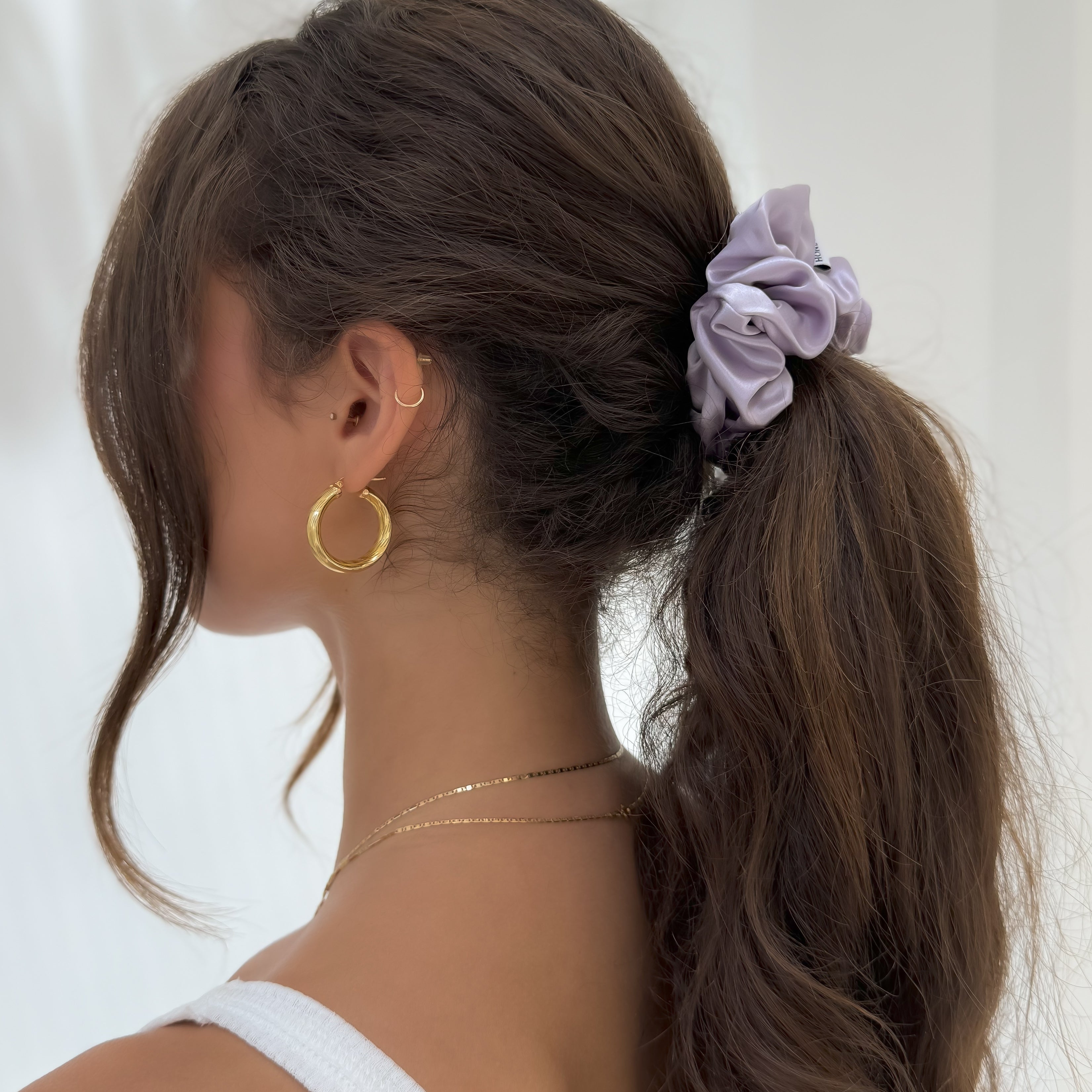 Indulge in timeless luxury with our Pure Silk Scrunchie, made from 100% organic mulberry silk. Thicker and more durable than regular silk, it offers a gentle, non-slip hold for all hair types, from fine strands to thick, textured hair. The premium durable elastic ensures a secure fit without easily stretching out, while the anti-breakage and anti-frizz properties of real silk protect your hair, preventing creasing, thinning, and pony-related headaches. Elevate your haircare routine with this elegant, long-lasting accessory.