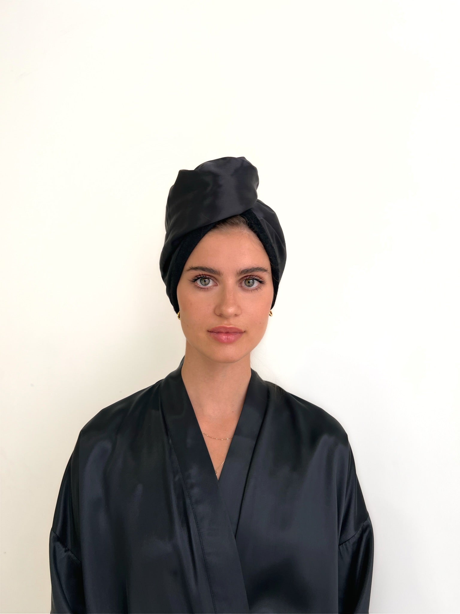Experience luxury with our Organic Silk Towel Wrap. One side features 6A organic mulberry silk (22 momme) to reduce frizz, prevent breakage, and keep hair smooth, perfect for sleep or daily use with hair oils/treatments. The other side is lined with an organic bamboo towel, which is both antibacterial and gentle moisture absorption properties without causing damage vs. heavy wet hair towels. Alternate sides as needed — avoid using the silk side on wet hair.