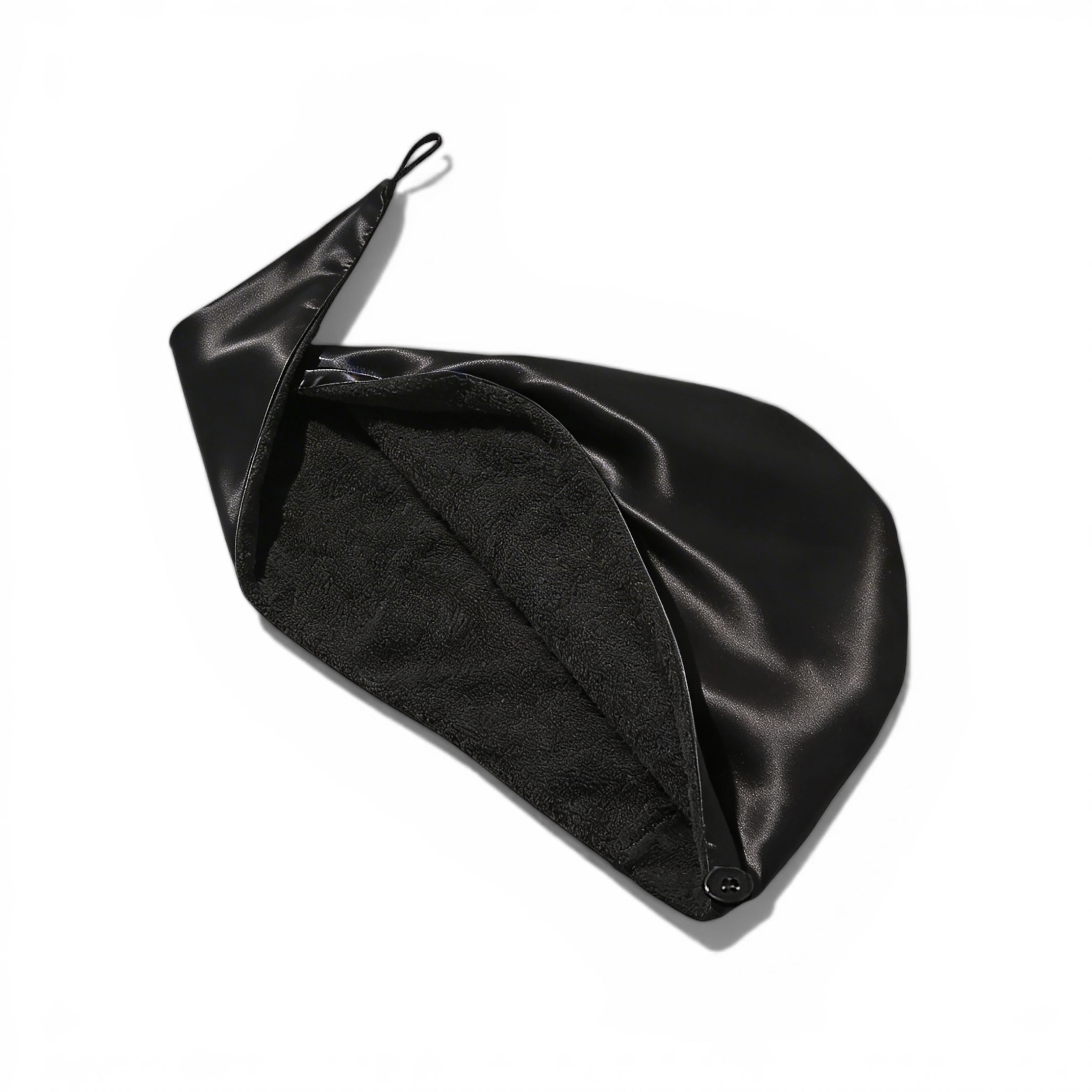 A dual-sided ritual combining the softness of antibacterial bamboo with the smoothness of pure mulberry silk. Bamboo absorbs moisture quickly and efficiently without the weight of a regular towel pressing down on fragile wet hair. Bamboo is naturally antibacterial. It stays fresh. It stays clean. Silk preserves. Keeping your blowout intact and your hairstyle frizz-free for as long as you need. Wrap your hair during a hair oiling or treatment and the silk won't pull the product out or transfer it onto your pillowcase the way synthetic covers do. You get the full benefit of the treatment, whether you're lounging, going about your day, or sleeping in it. Ideal for curly hair, frizzy hair, treated hair, extensions, fine hair and everything in between.