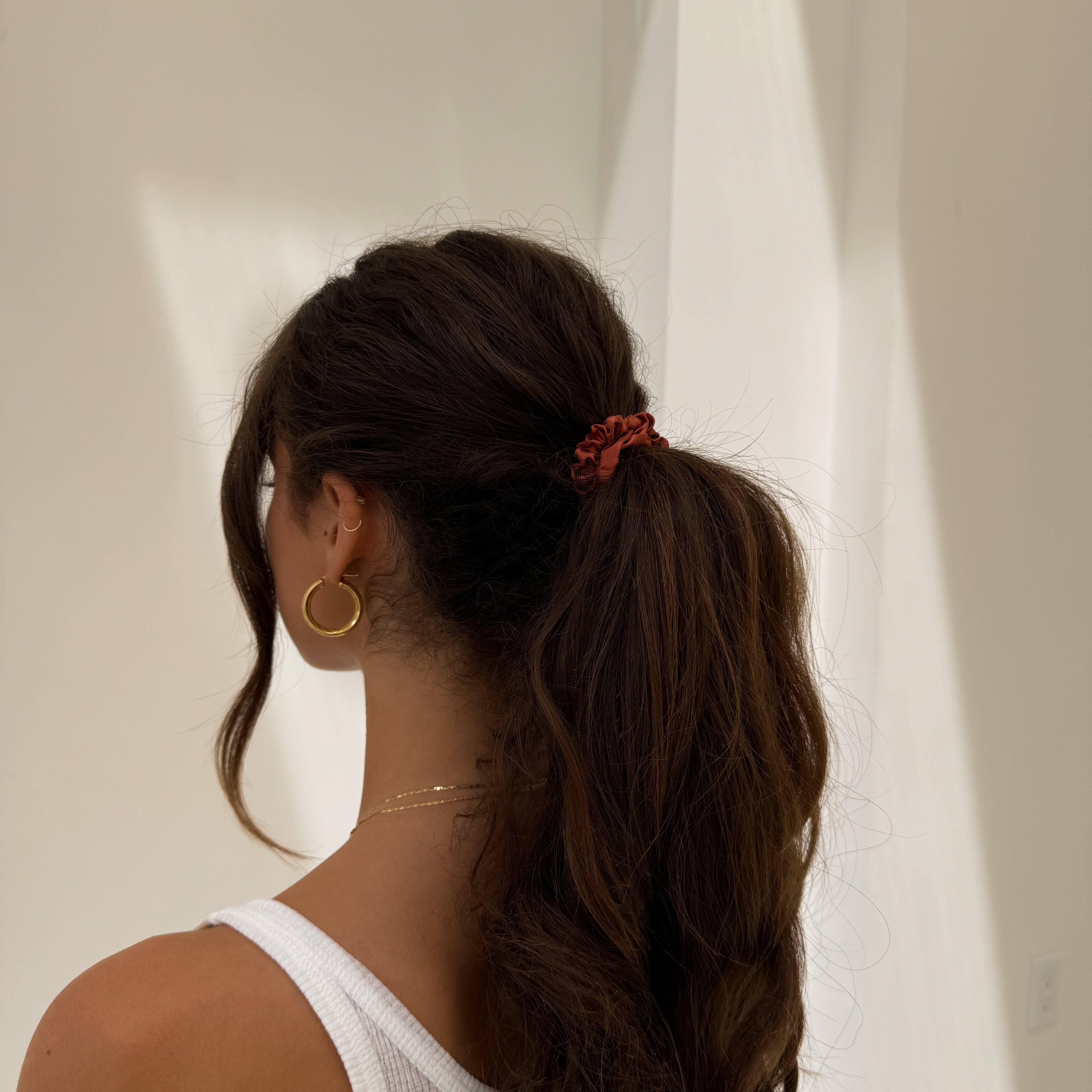 Indulge in timeless luxury with our Pure Silk Scrunchie, made from 100% organic mulberry silk. Thicker and more durable than regular silk, it offers a gentle, non-slip hold for all hair types, from fine strands to thick, textured hair. The premium durable elastic ensures a secure fit without easily stretching out, while the anti-breakage and anti-frizz properties of real silk protect your hair, preventing creasing, thinning, and pony-related headaches. Elevate your haircare routine with this elegant, long-lasting accessory.